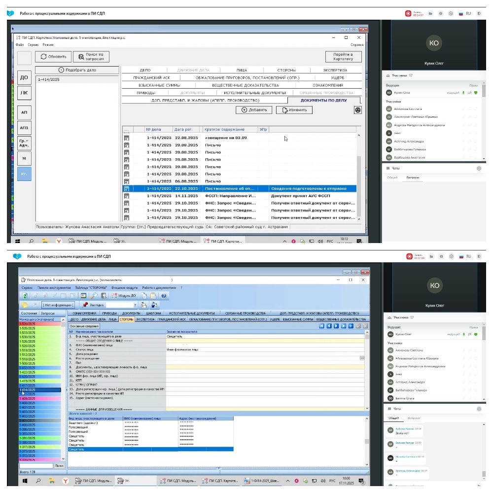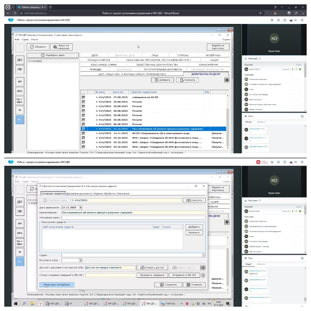 17.11.2025 Управлением Судебного департамента в Астраханской области совместно с филиалом ФГБУ ИАЦ Судебного департамента в Астраханской области проведен семинар (в формате вебинара) с судьями, начальниками отделов делопроизводства и кадров районных, гарнизонных военных судов Астраханской области, государственными гражданскими служащими, ответственными за работу с процессуальными издержками в ПИ СДП по теме: «Работа с процессуальными издержками в ПИ СДП» (докладчик: ФГБУ ИАЦ Судебного департамента в Астраханской области Кулик О.В.).